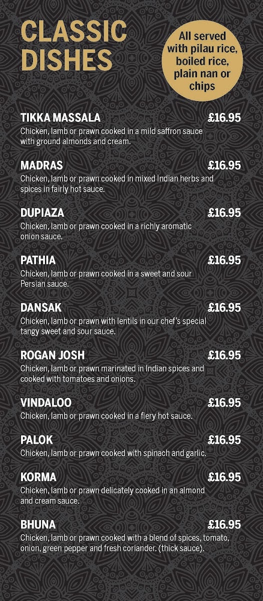 Accompaniments such as Pilau Rice and Masala Chips elevate the meal, while an array of artisan naan options ensures there's something for everyone.