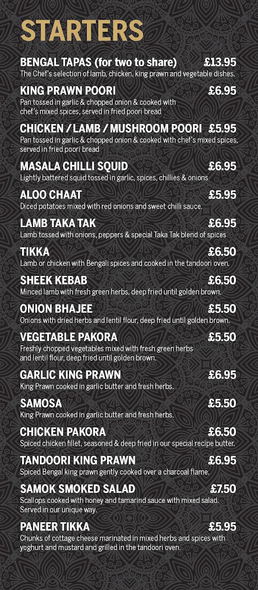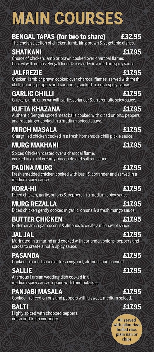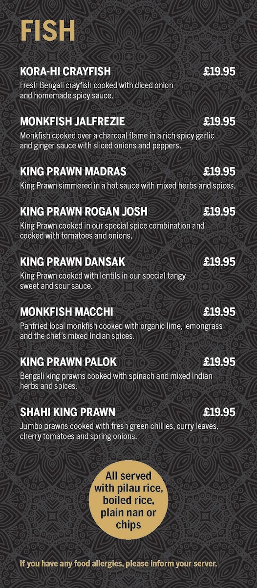 Highlights include the exquisitely prepared KoraHi Crayfish, featuring fresh Bengali crayfish cooked in a spicy homemade sauce at £19.95. For seafood lovers, the Monkfish Jalfrezie and King Prawn Madras are must-tries, each simmered to perfection with aromatic herbs.